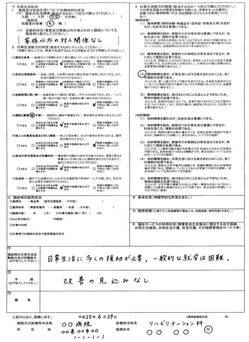 診断書の「日常生活能力の程度」が(4)、「日常生活能力の判定」が助言や指導があればできる、または助言や指導をしてもできない若しくは行わないに評価されると2級の可能性が高くなります。 |