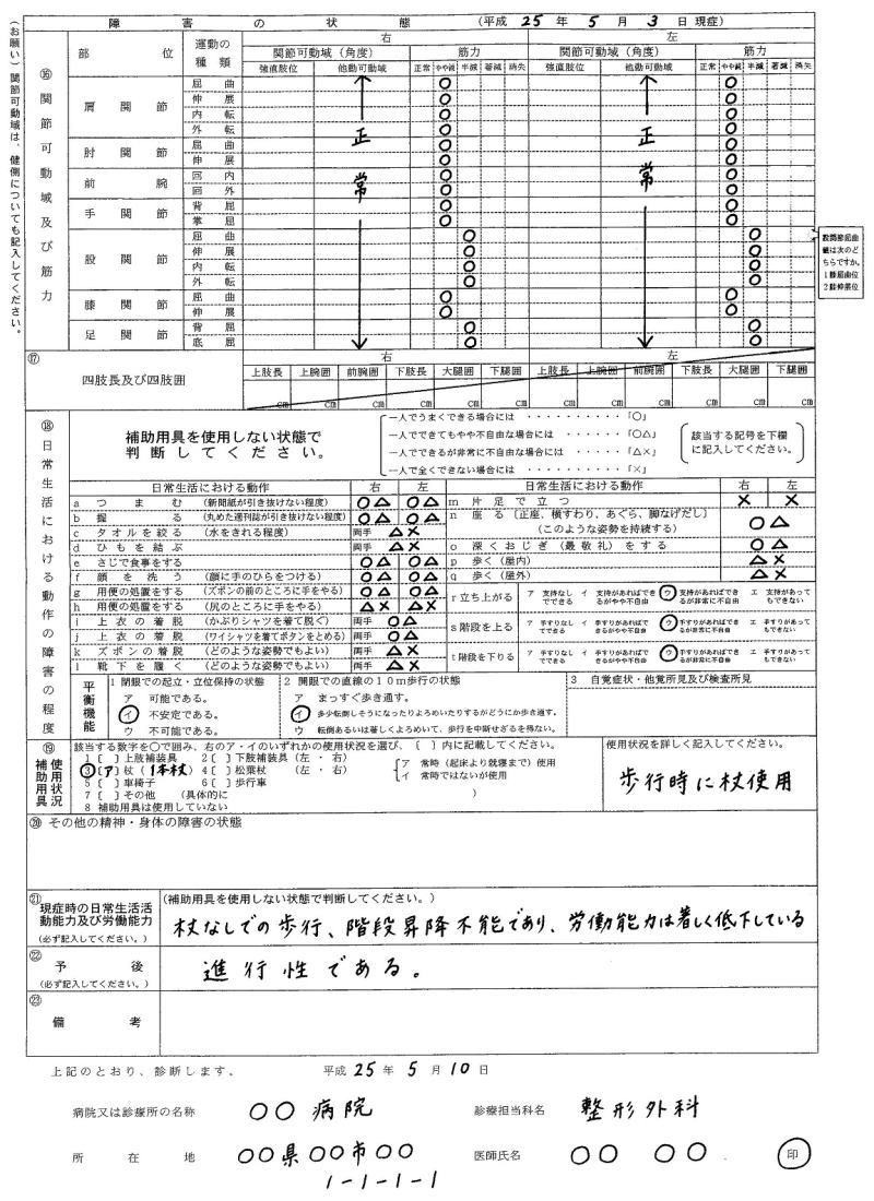 四肢障害は、日常生活動作が認定のポイントとなる。上記診断書では、「Q日常生活における動作の障害の程度」のほとんどが○△か△×となっており、予後も進行性となっており、近い将来、軽減しないことがあきらかなため、日常生活が著しい制限を受けていると判断でき、2級に認定される可能性が高い。