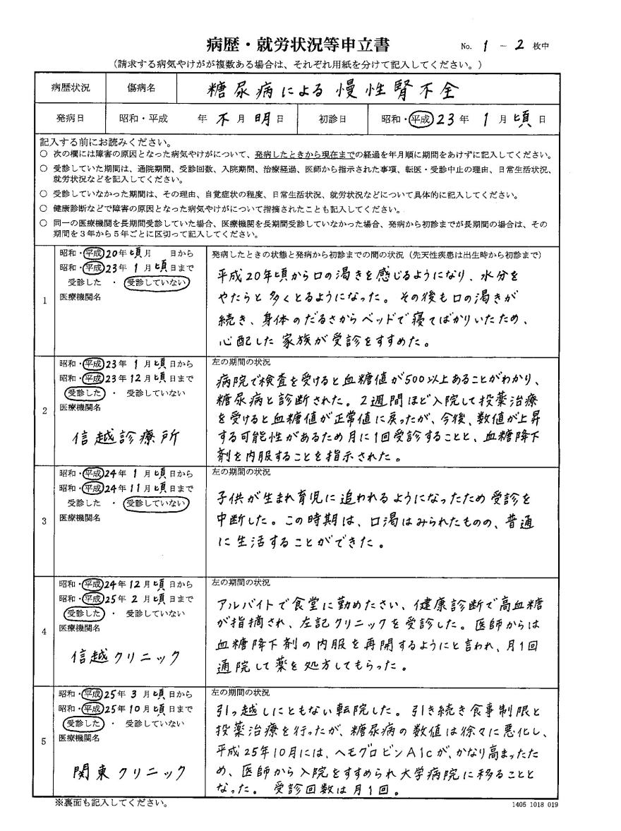 〔傷病名:糖尿病による人工透析〕 発病日:不明 初診日:平成23年1月頃