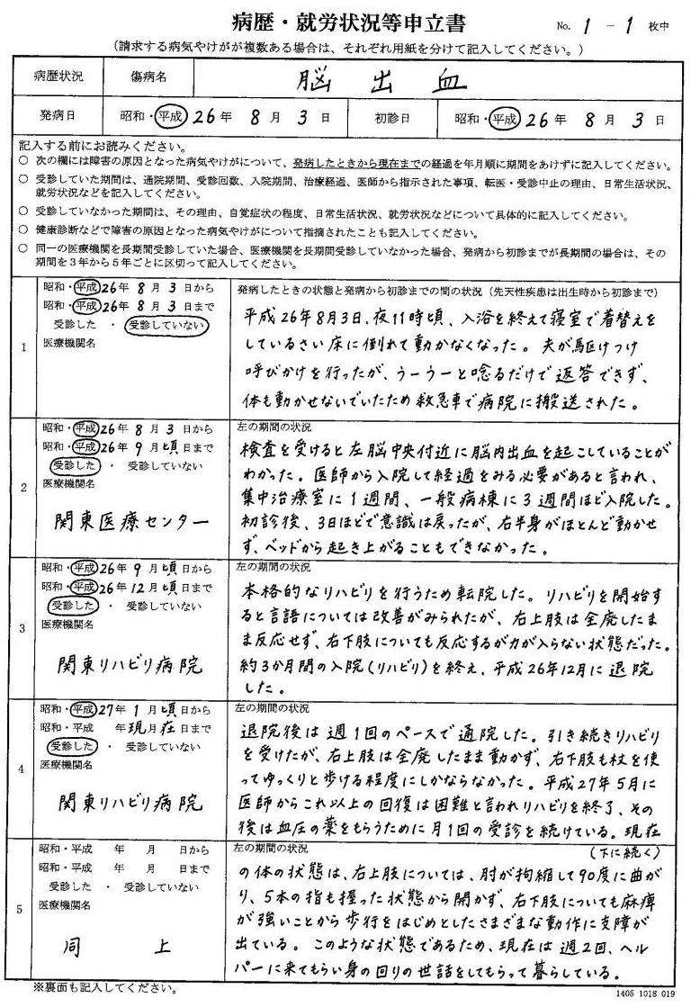 しかし、現在の審査の厳しさから考えれば、この病歴状況申立書を使って、自分の障害の重さをきちんと訴えておきたいものです。脳出血によって上肢・下肢のどの部分に機能障害があるのか、日常生活の何に不便を感じているのかを積極的に訴えていきましょう。 |