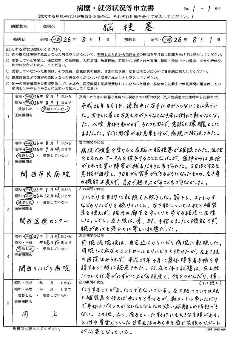 いい加減に書いて提出していると返戻となり、障害等級を認定してもらえません。発病から現在までの病気の経緯が漏れなく書かれていれば申請上は問題ありませんが、自分の障害を少しでも評価してもらえるよう、上肢・下肢の状態の悪さをきちんと訴えてください。