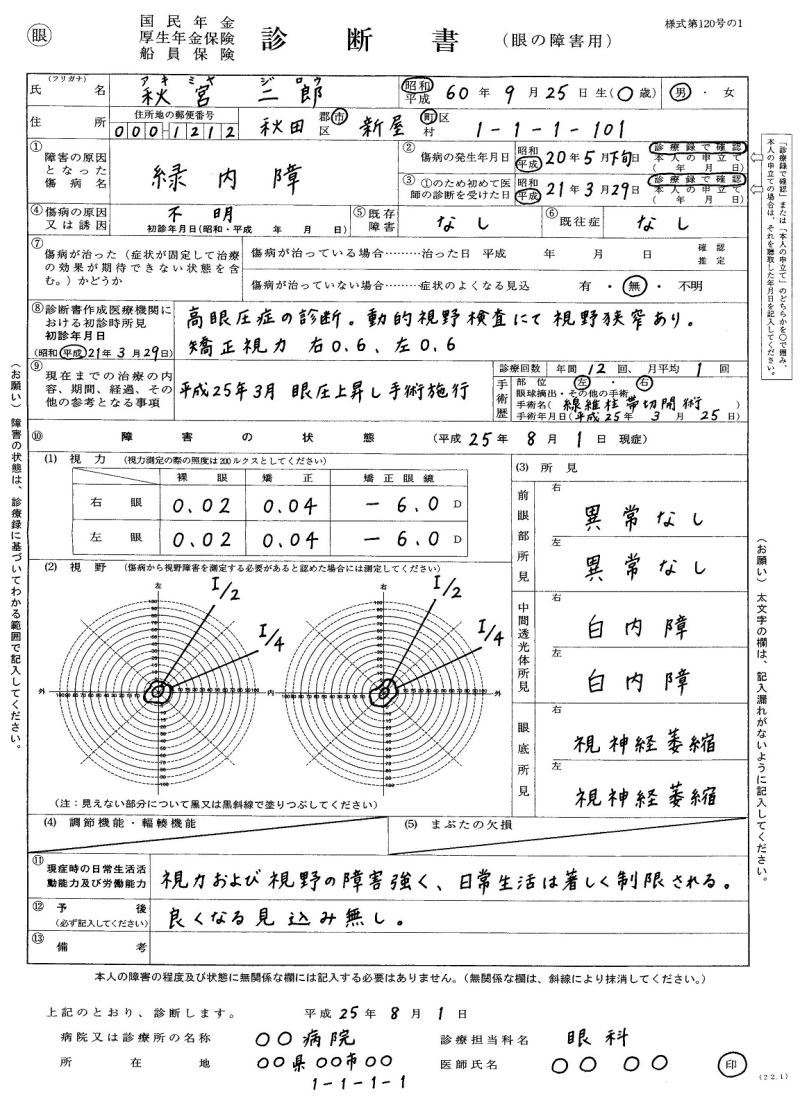 上記診断書では、矯正視力が右0.04、左0.04であり、両眼の視力の和は0.08であるから、視力のみで2級に該当する。一方、視野は両眼とも5度以内となっていることから視野のみでも2級に該当する。この場合、視力2級+視野2級の併合認定が行われ、1級の障害年金が支給される。