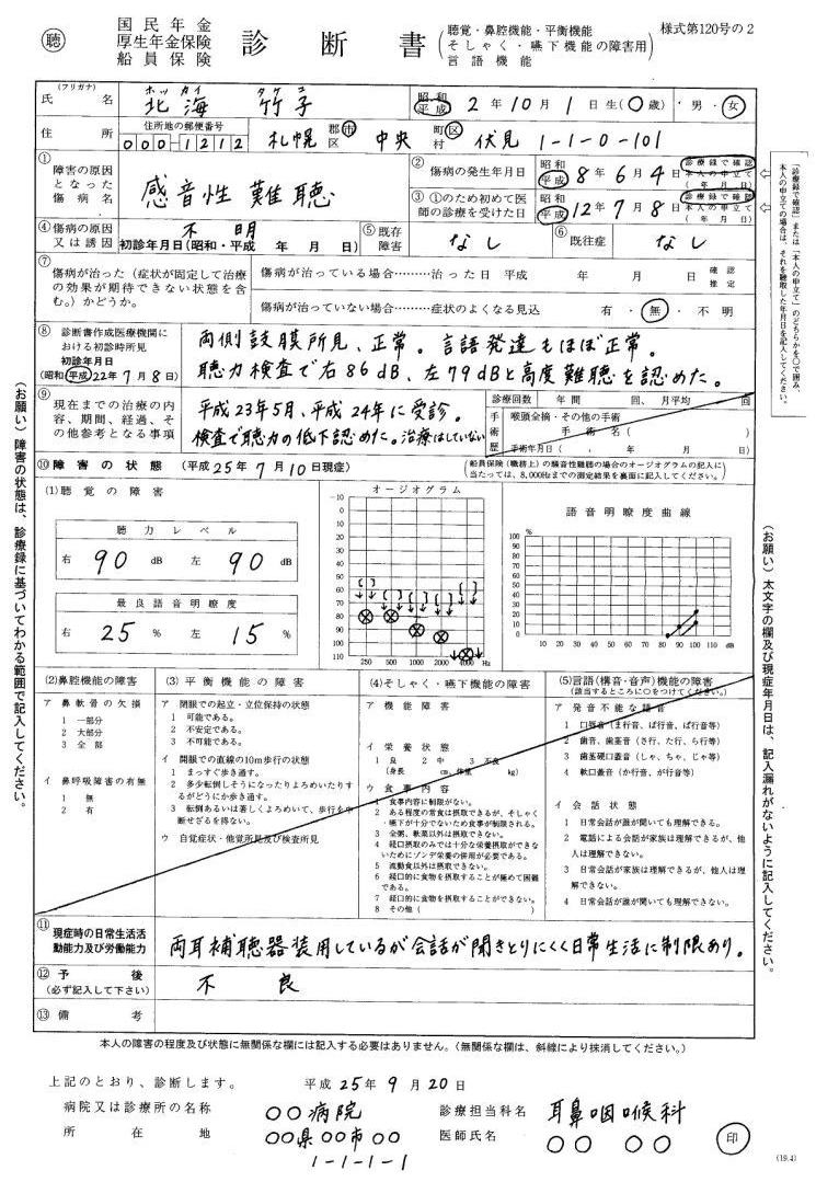 上記診断書では、聴力レベル(右90dB、左90dB)だけで2級の基準をクリアしている。このケースでは最良語音明瞭度は関係ないが、仮に聴力レベルが基準をクリアしていなかった場合でも、最良語音明瞭度で2級に届くケースは多々ある。ちなみに上記の場合、聴力レベルが左右とも80dB程度しかなかったとしても、最良語音明瞭度が低いため、2級に認定される。
