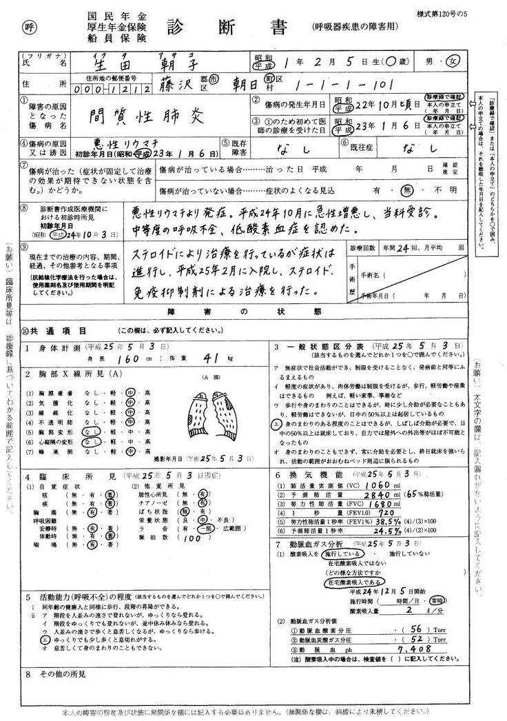 呼吸器疾患の場合、「2胸部X線所見」「3一般状態区分表」「4臨床所見」「5活動能力」「6換気機能」「7動脈血ガス分析」が最重要ポイントです。 |